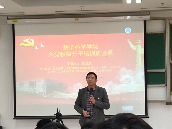 2019年10月23日,北京航空航天大学数学科学学院入党积极分子培训班第二次党课暨本研学生学习日活动在J3-210进行。数学学院特别邀请了原北航第一基础课部高等数学教研室离休老师文益民老先生来到沙河校区,与学院师生共享“爱党爱国,传承革命精神,做空天报国的北航人”的故事。数学学院离退休党支部书记徐兵老师和学院师生200余人参加了此次活动。